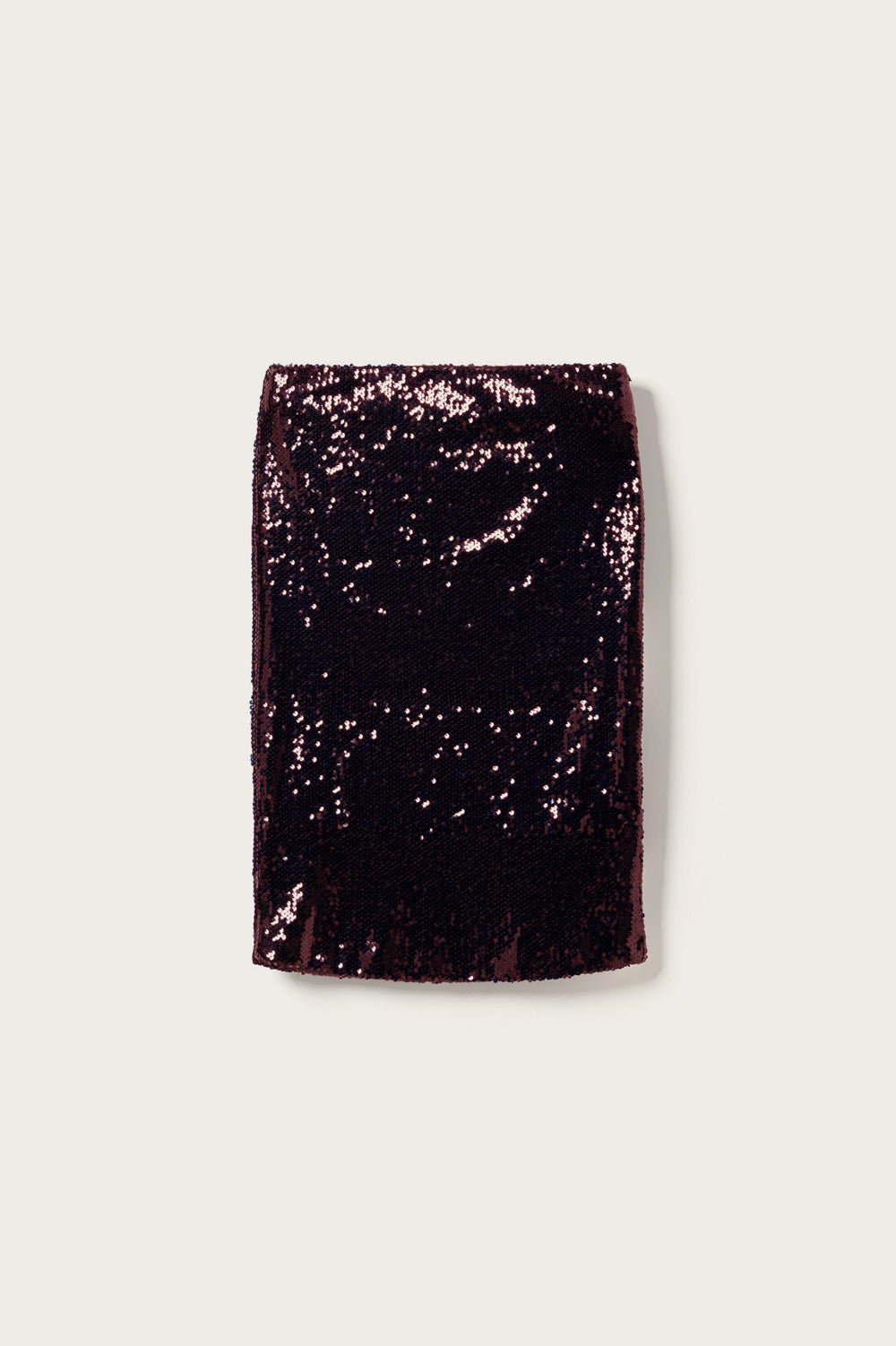 Kayden Long Skirt is a midi-length skirt with sequins and a side zip closure.
