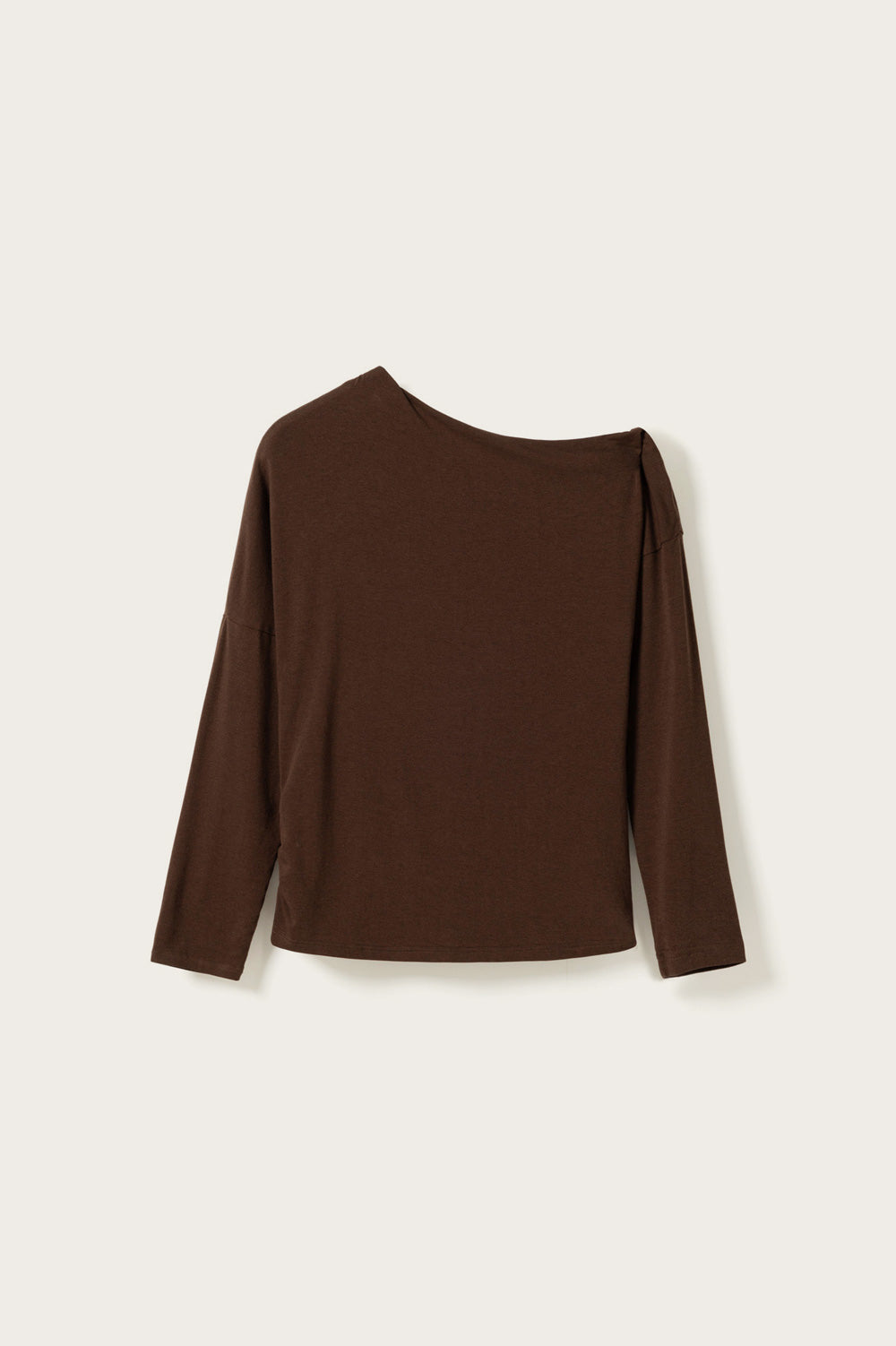 Lanna Top is a long-sleeved blouse with an asymmetric cutline at the right shoulder and a fitted silhouette, making it easy to style for both everyday wear and festive occasions.