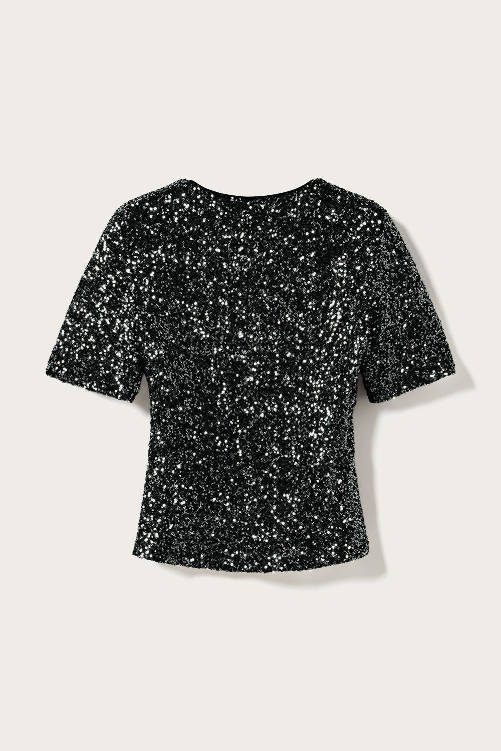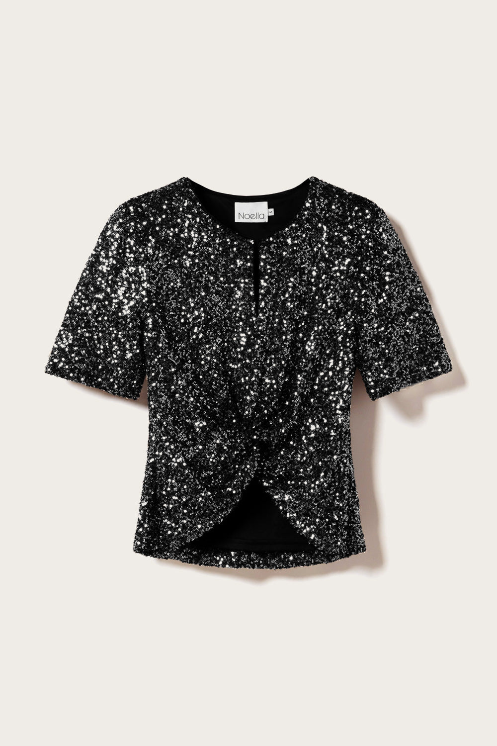 Lemon Blouse is a twisted T-shirt adorned with sequins and a front slit. Ideal for festive occasions, it pairs beautifully with high-waisted trousers or a skirt for a party look.