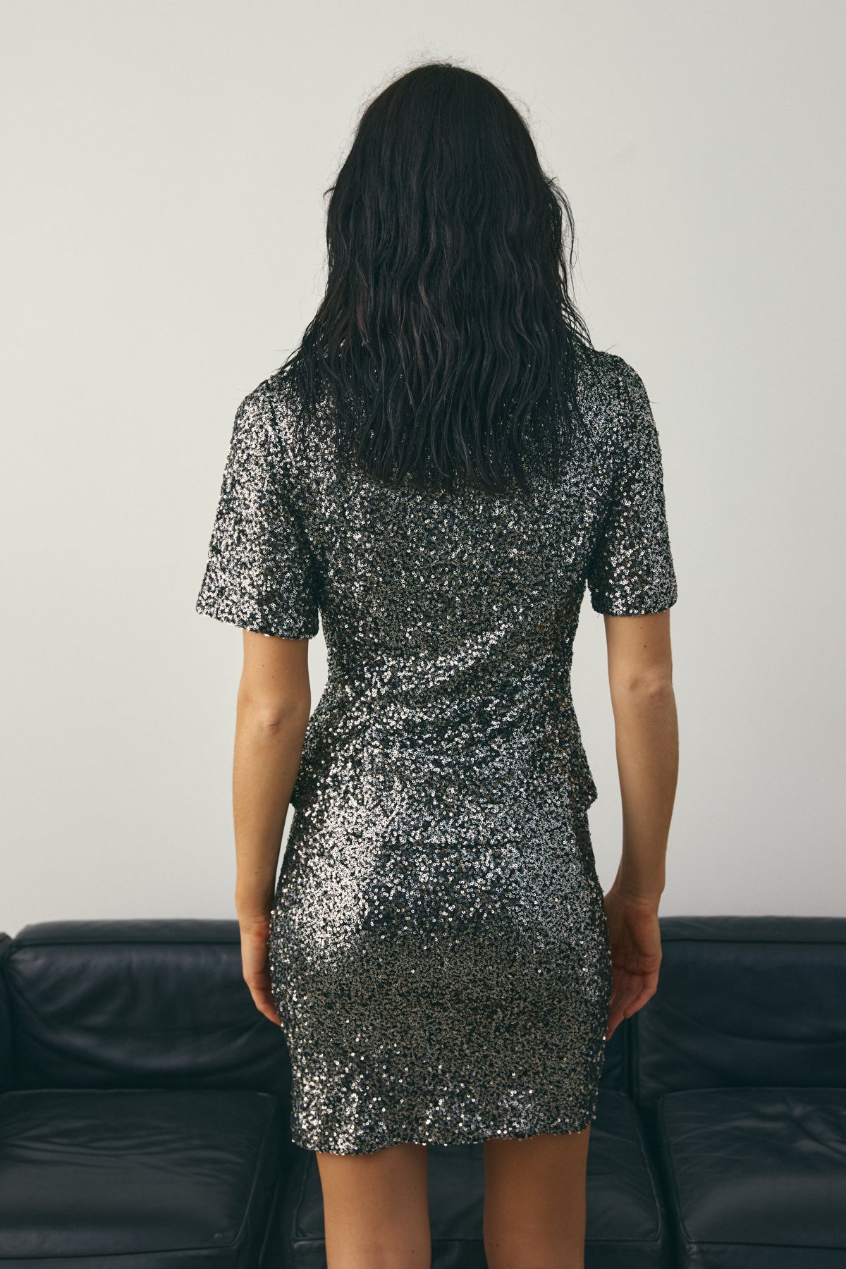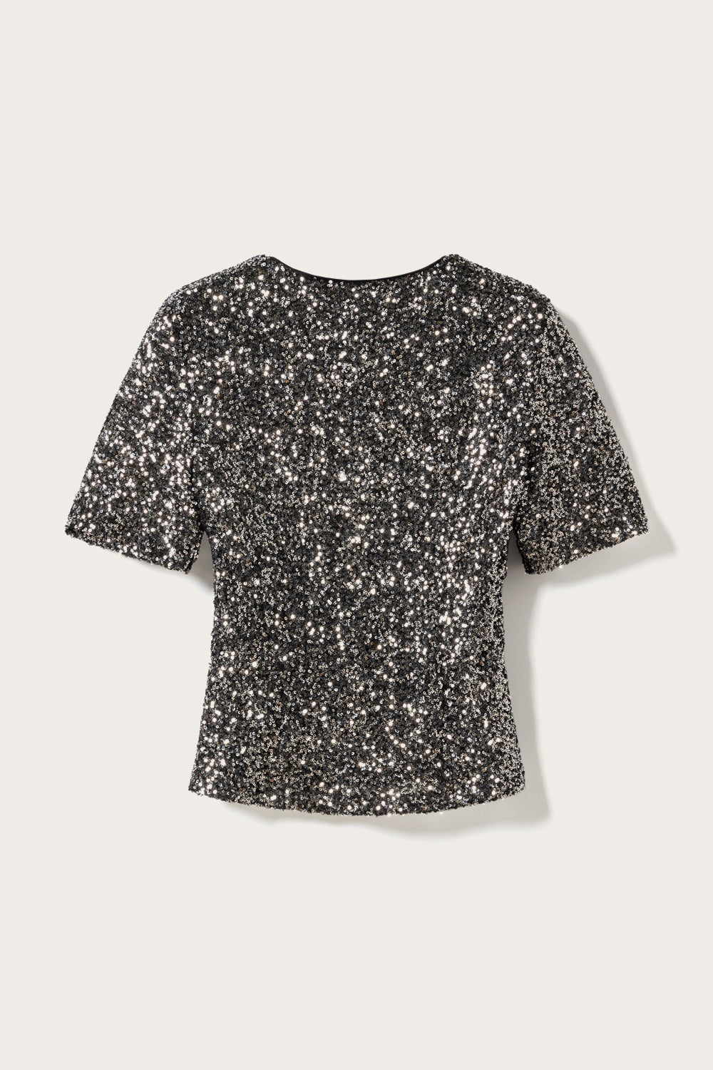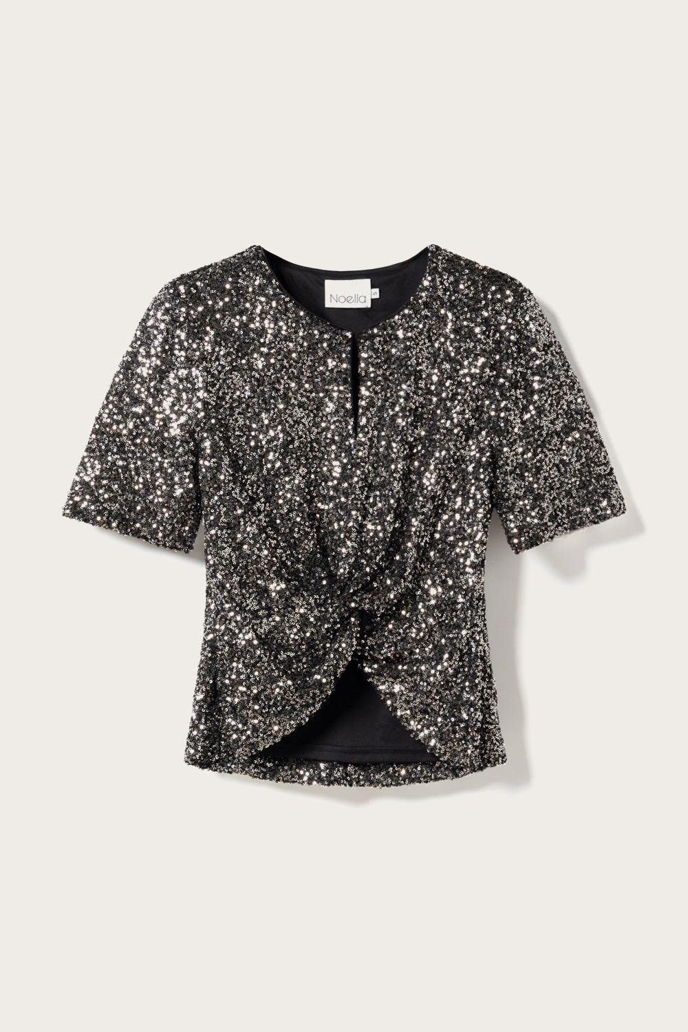 Lemon Blouse is a twisted T-shirt adorned with sequins and a front slit. Ideal for festive occasions, it pairs beautifully with high-waisted trousers or a skirt for a party look.