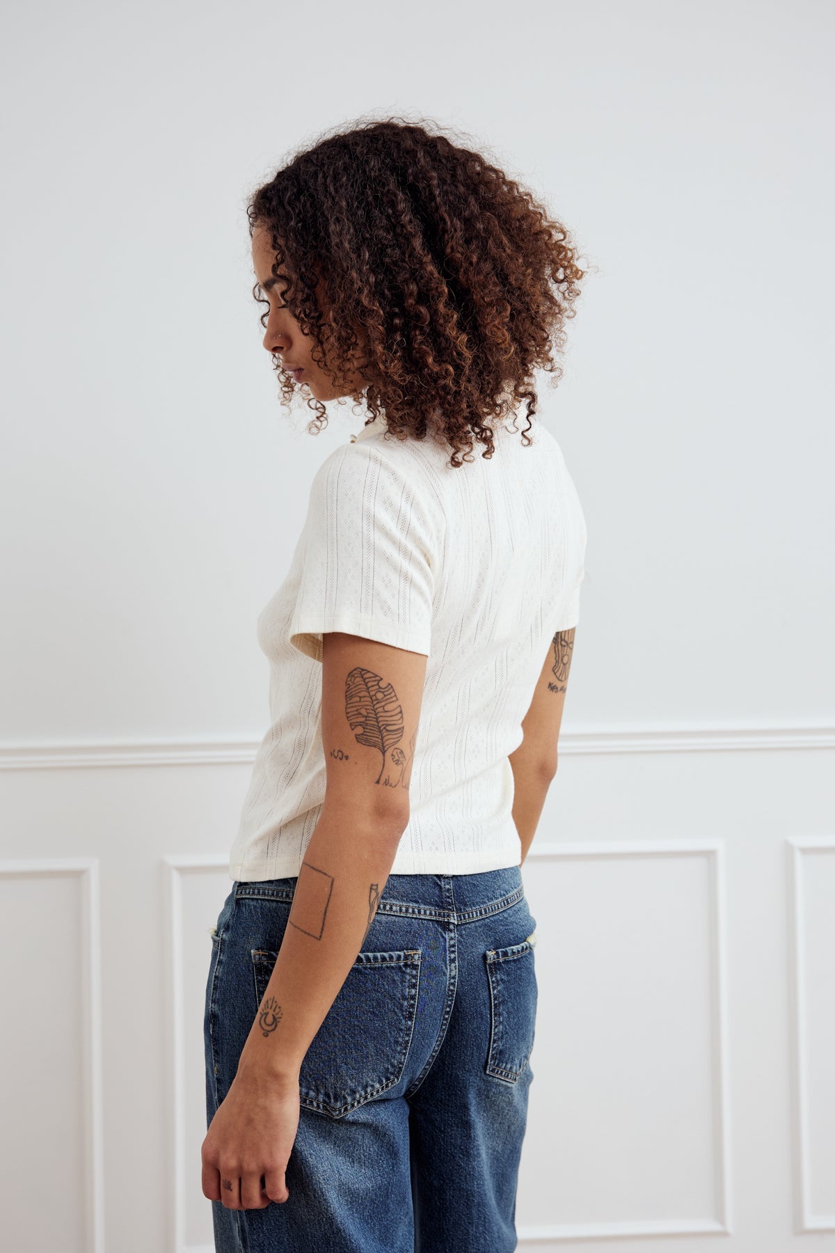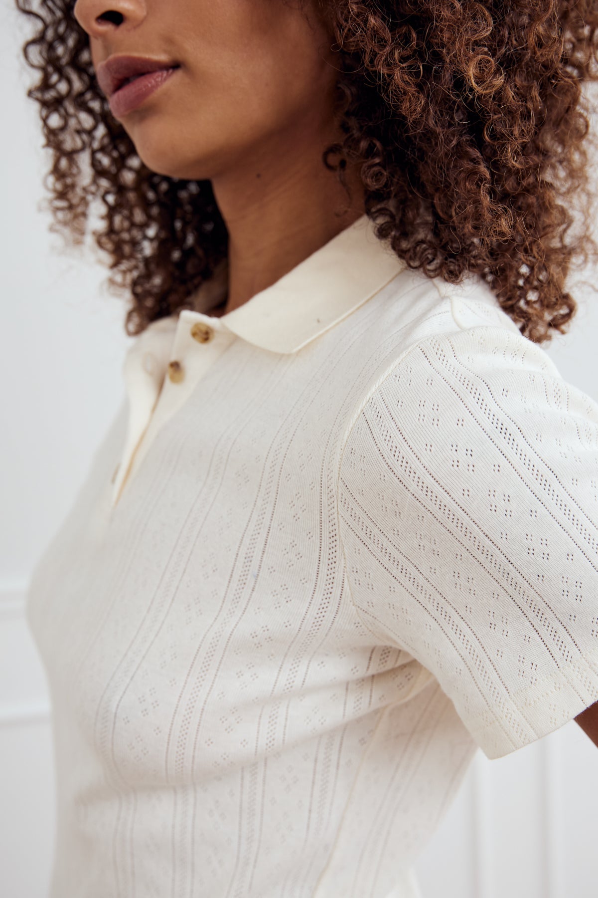 Lenni Top is a short-sleeved polo in pointelle knit with embroidered details, featuring a classic collar and button closure. The top has a regular fit, creating a simple and relaxed look. Style it under our Lenyx Knit or with a blazer.