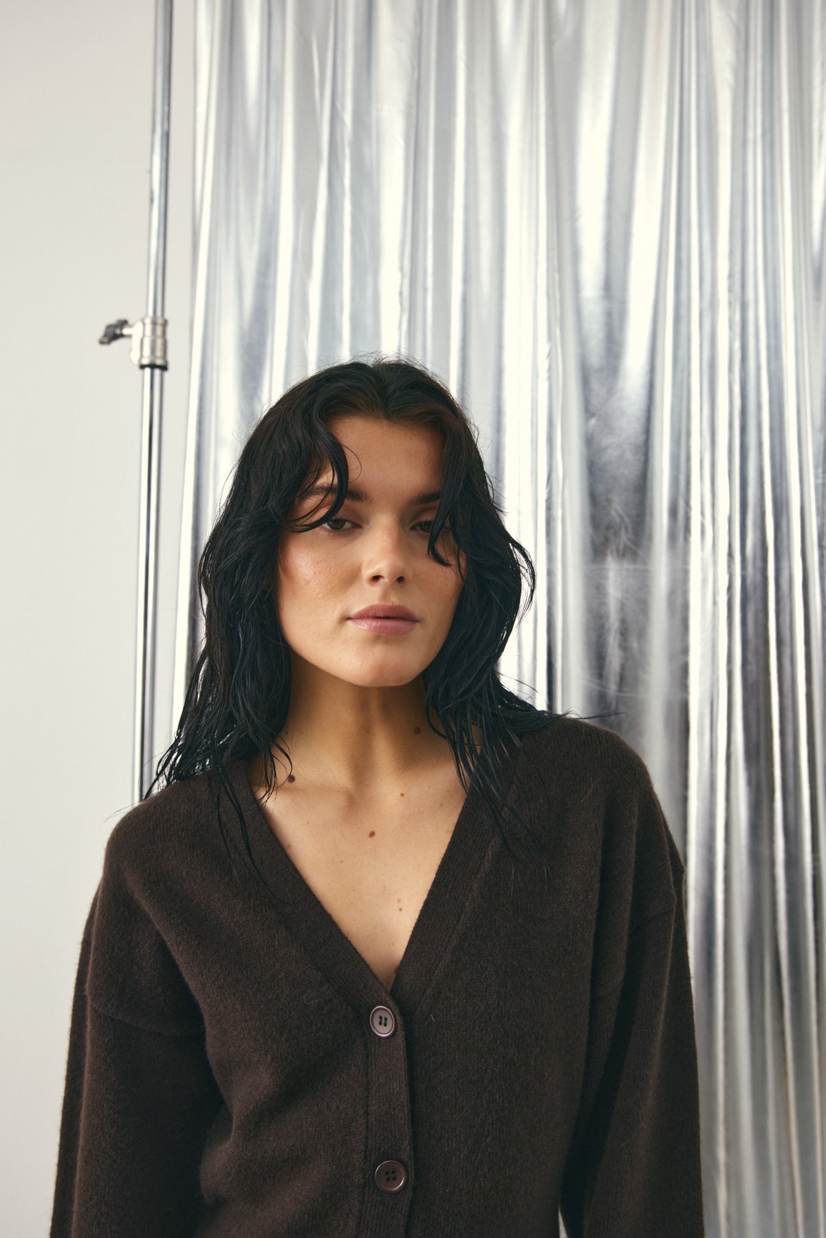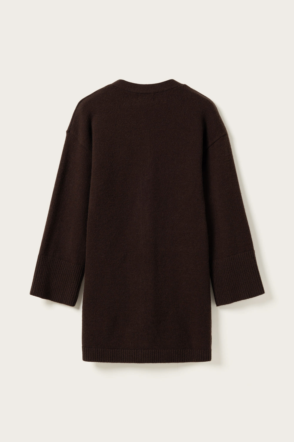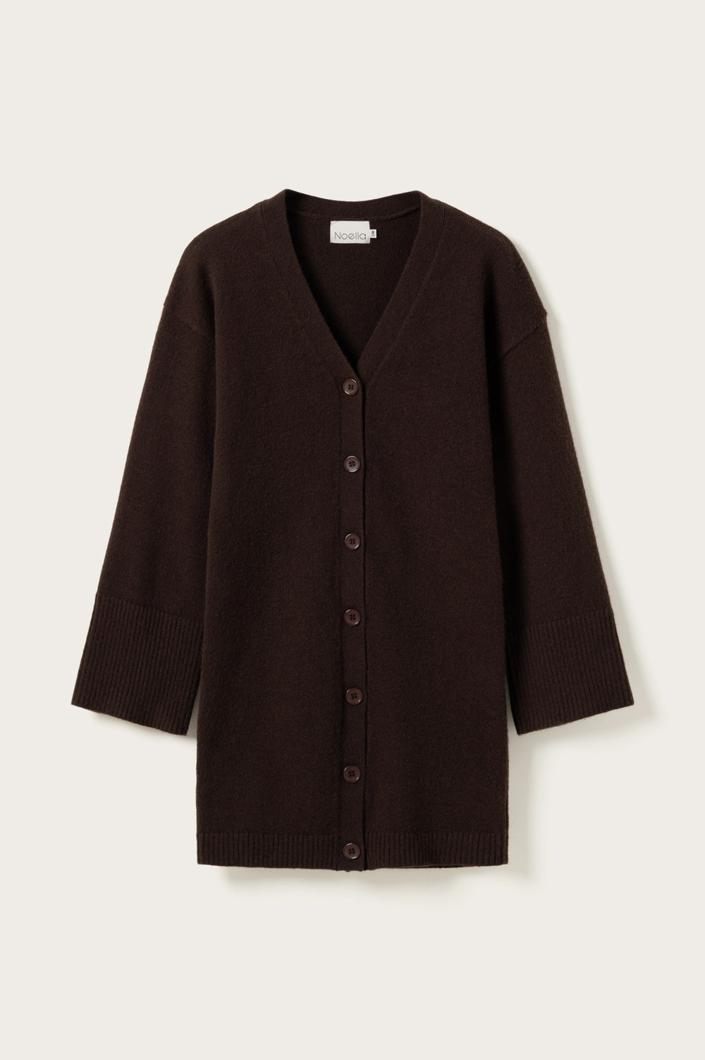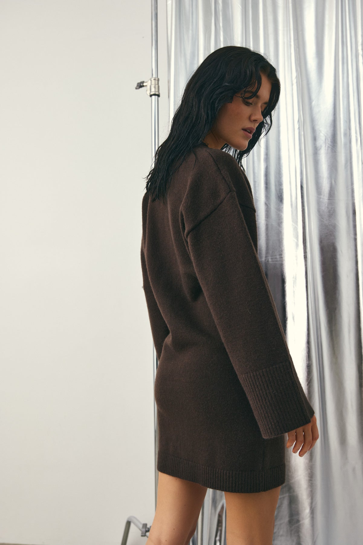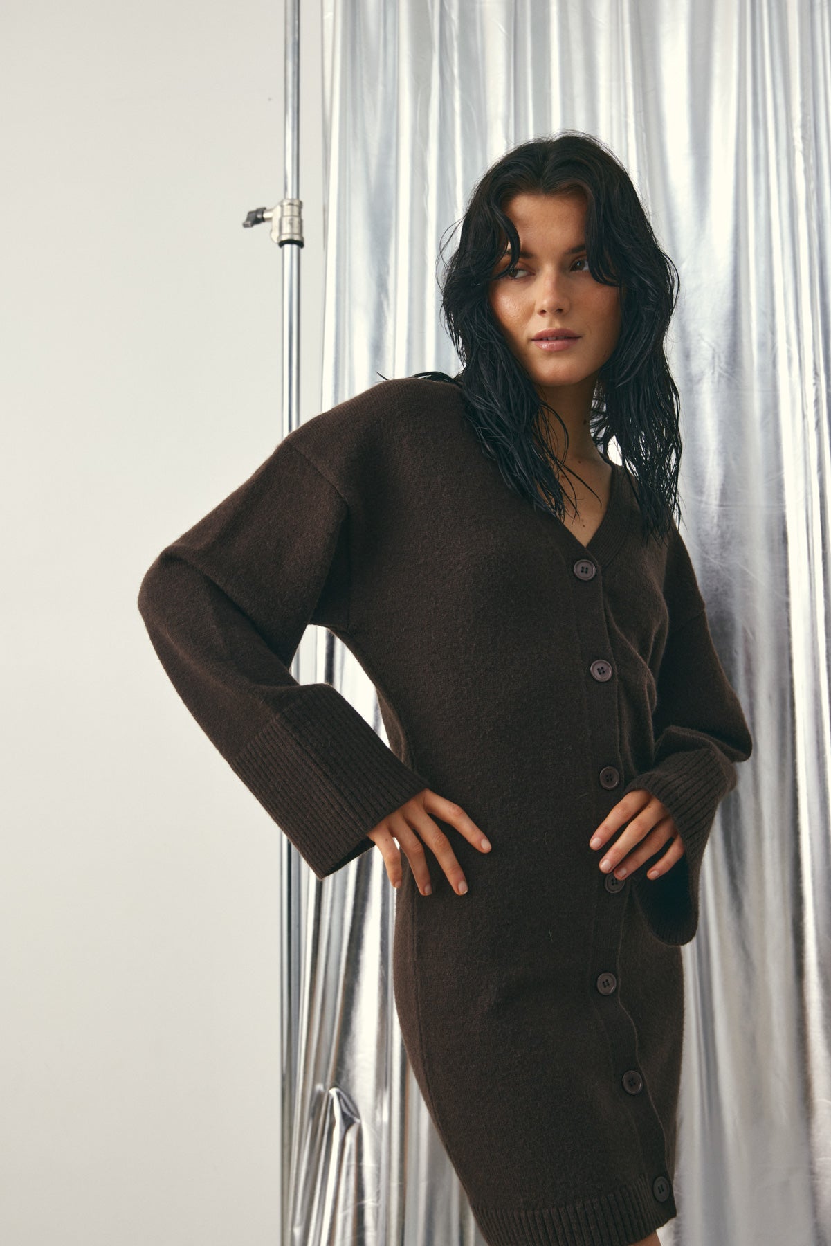 Lenyxanna Knit Dress is a cardigan dress with a fitted silhouette, long voluminous sleeves, and front button closure.