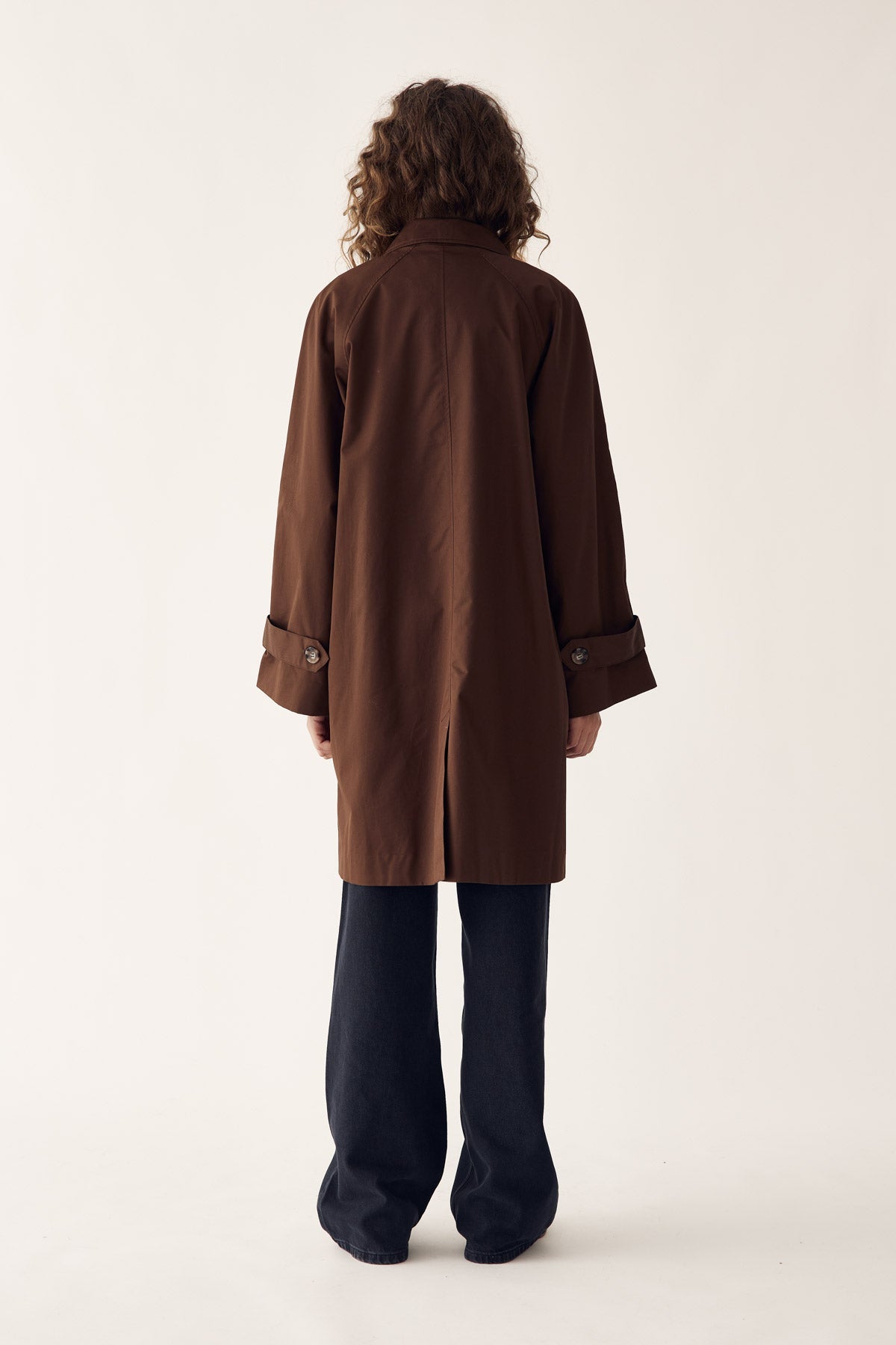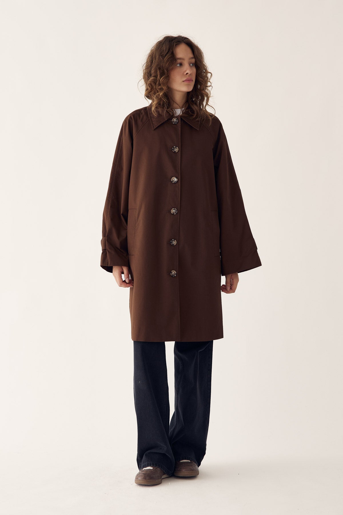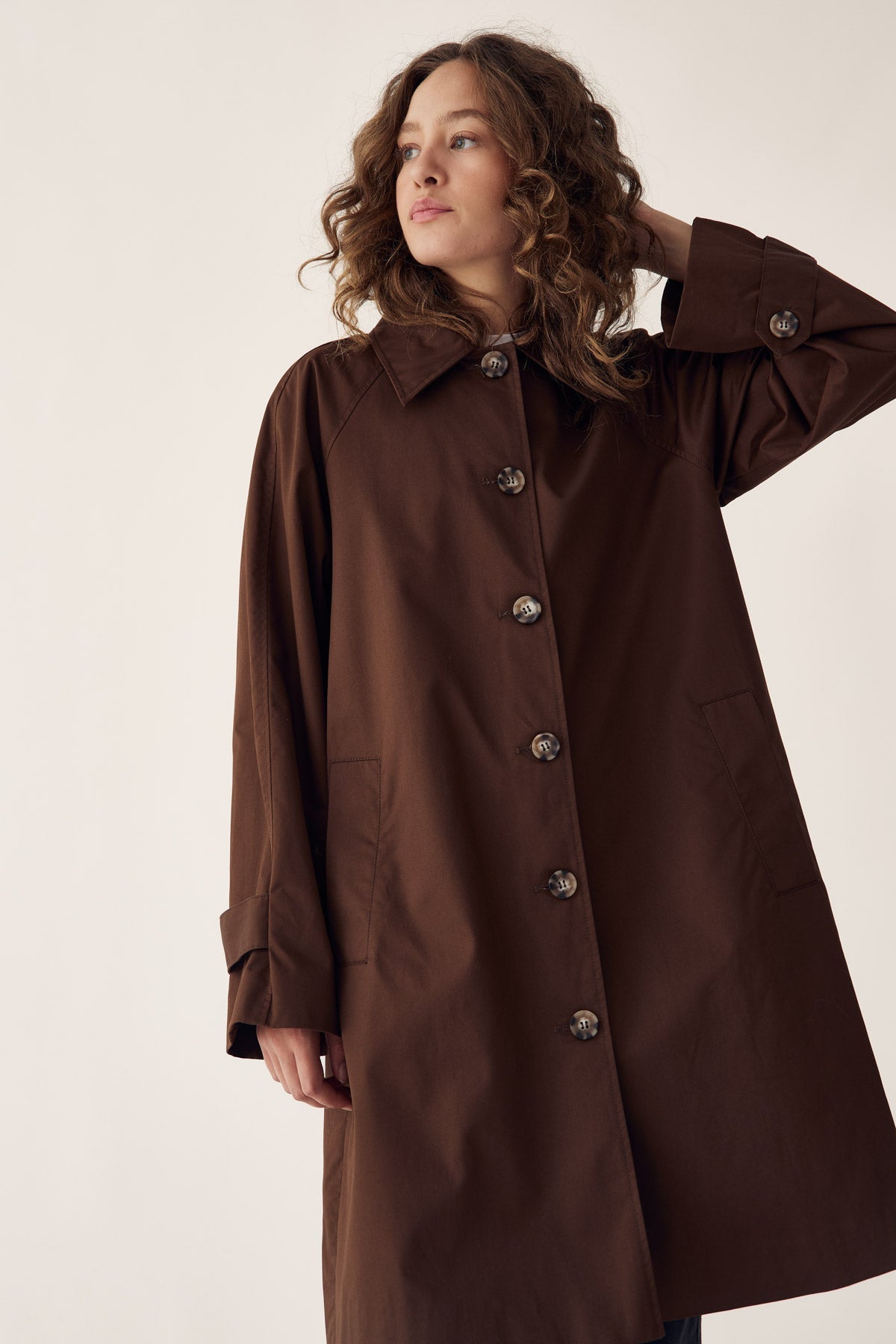 Lili Coat is a classic trench coat in 100 cotton with a collar, large buttons, and button details on the sleeves. Lili Coat features a mid length and a loose fit.