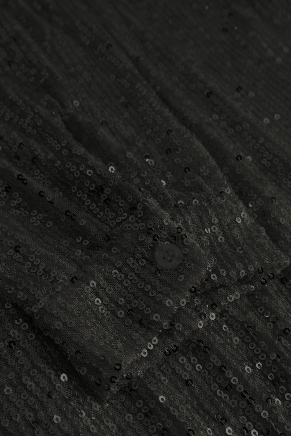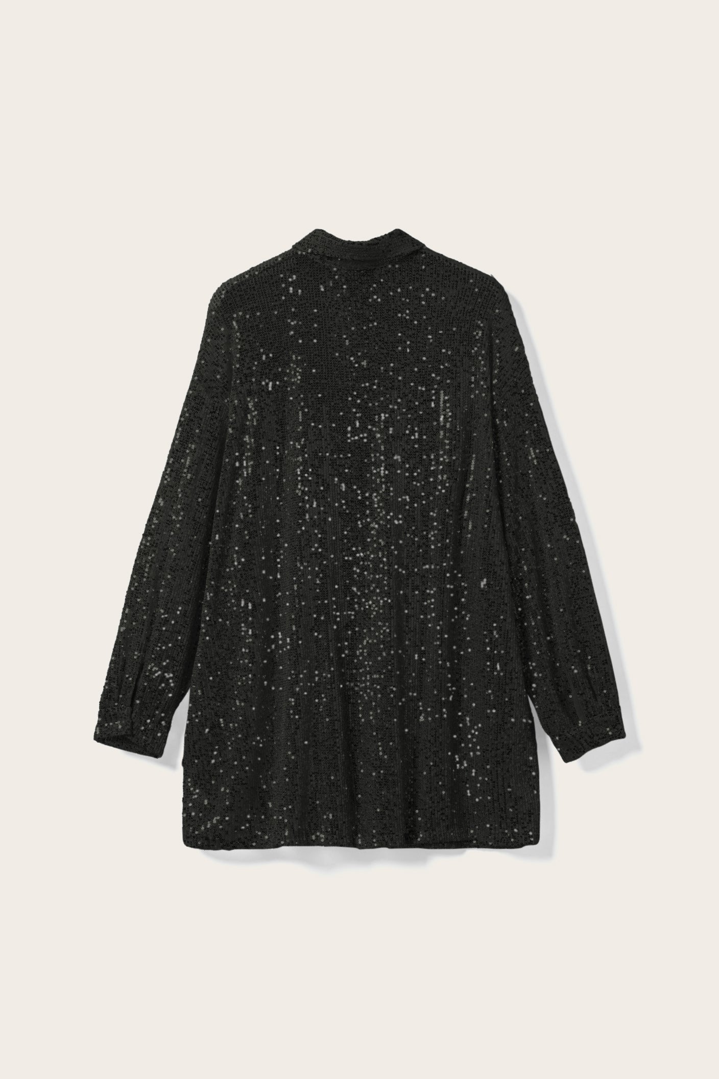 Lizanne Shirt is a sequin shirt with long sleeves, a classic collar, button closure, and a loose fit.