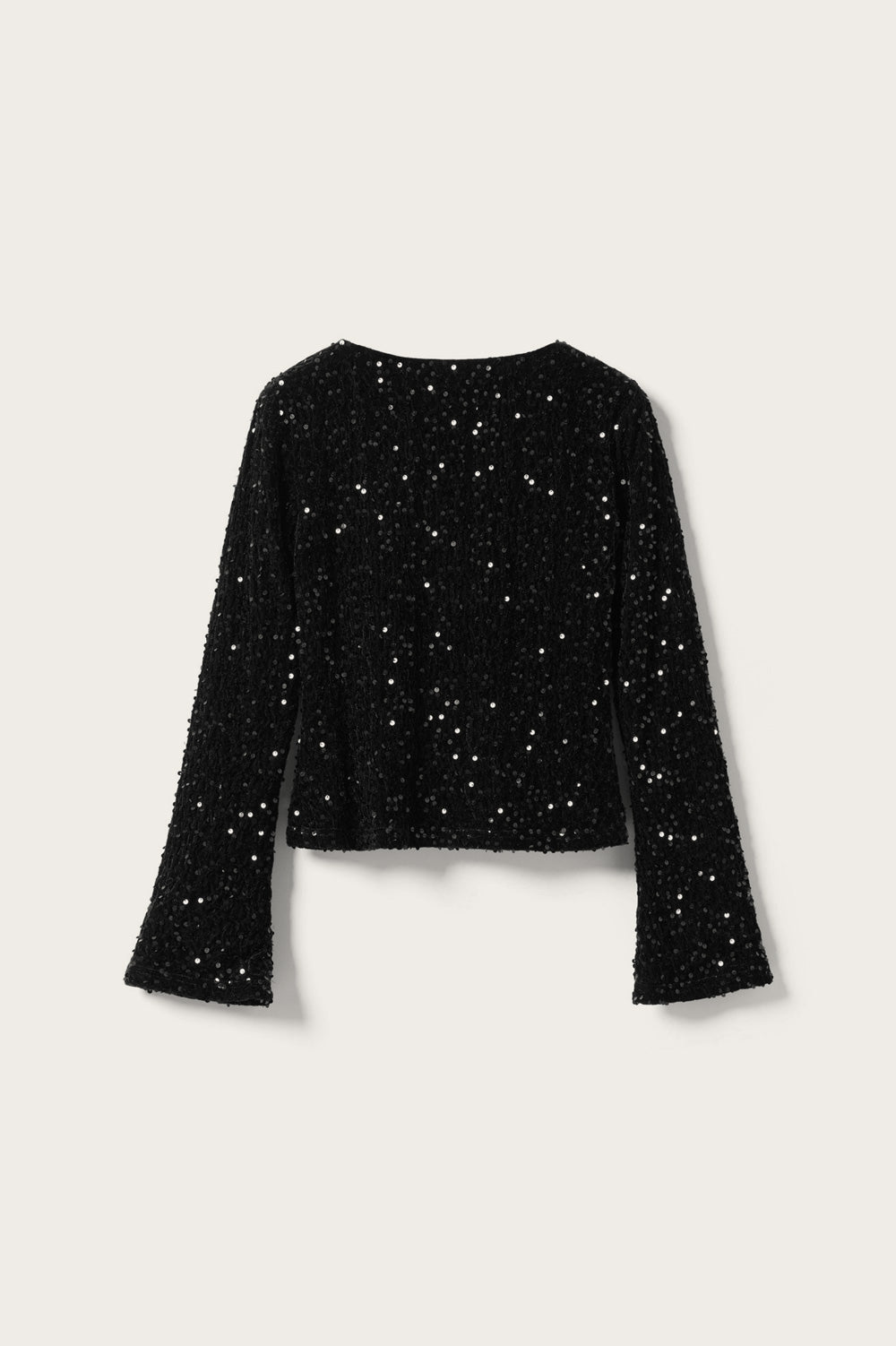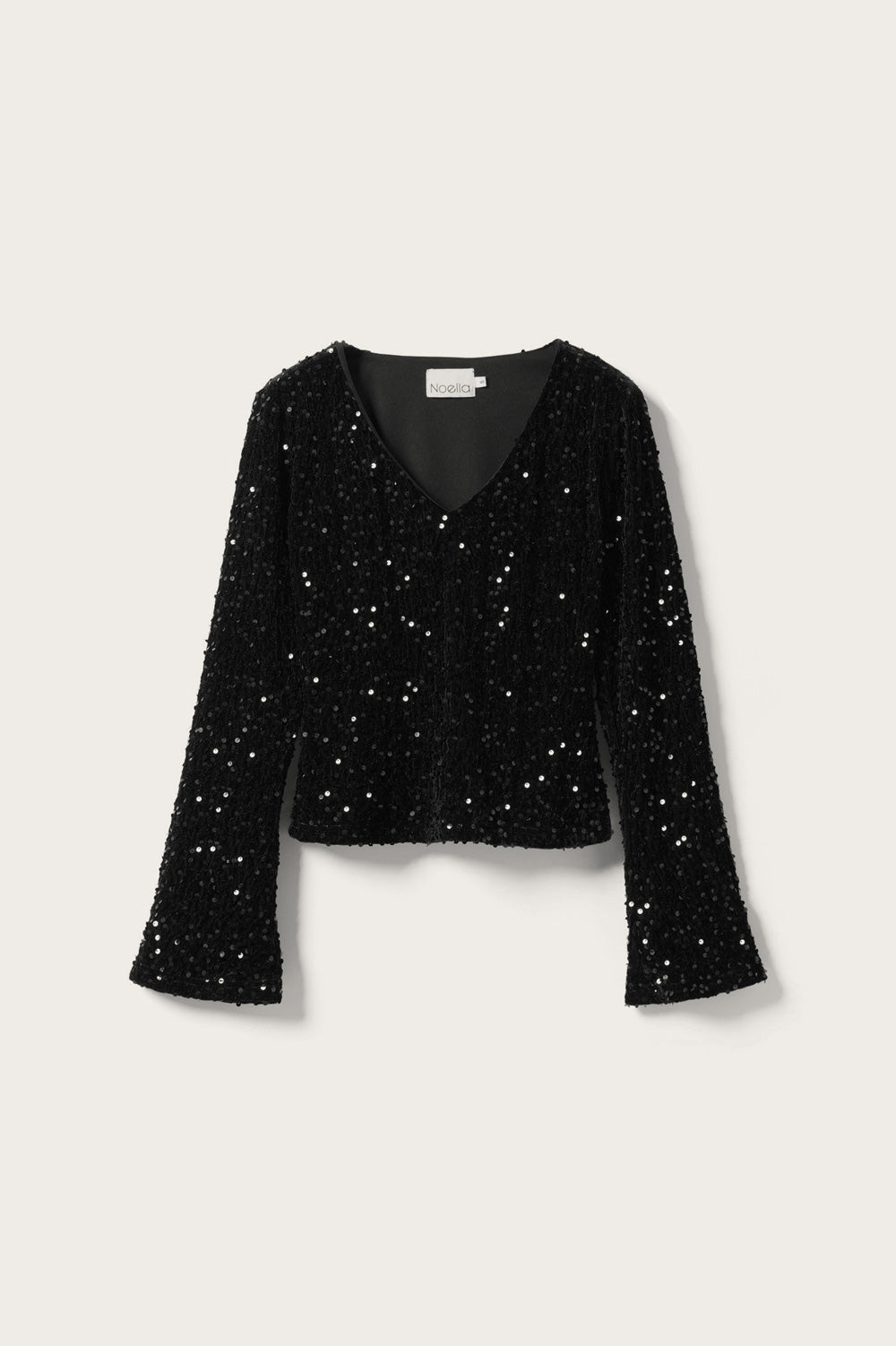 Lucille Top is a sequin top with long sleeves and a V-neckline. With Lucille Top’s fitted silhouette, it is perfect for festive occasions.