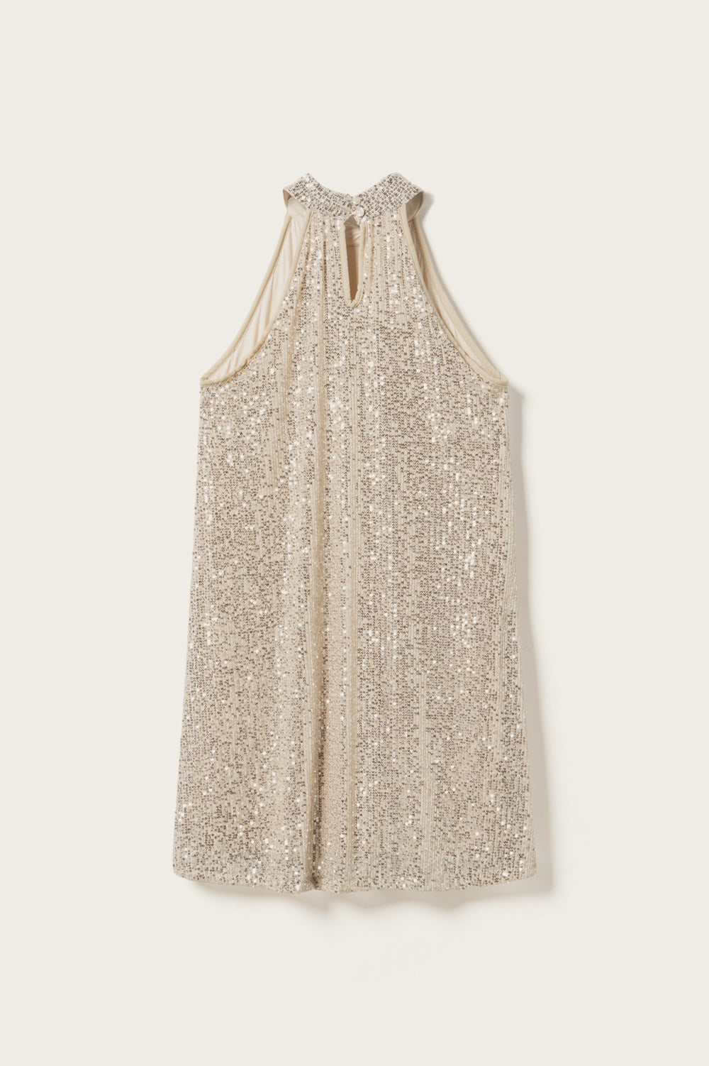Luvena Dress is a short dress in an A-line silhouette with halterneck and sequins. Perfect as partywear.