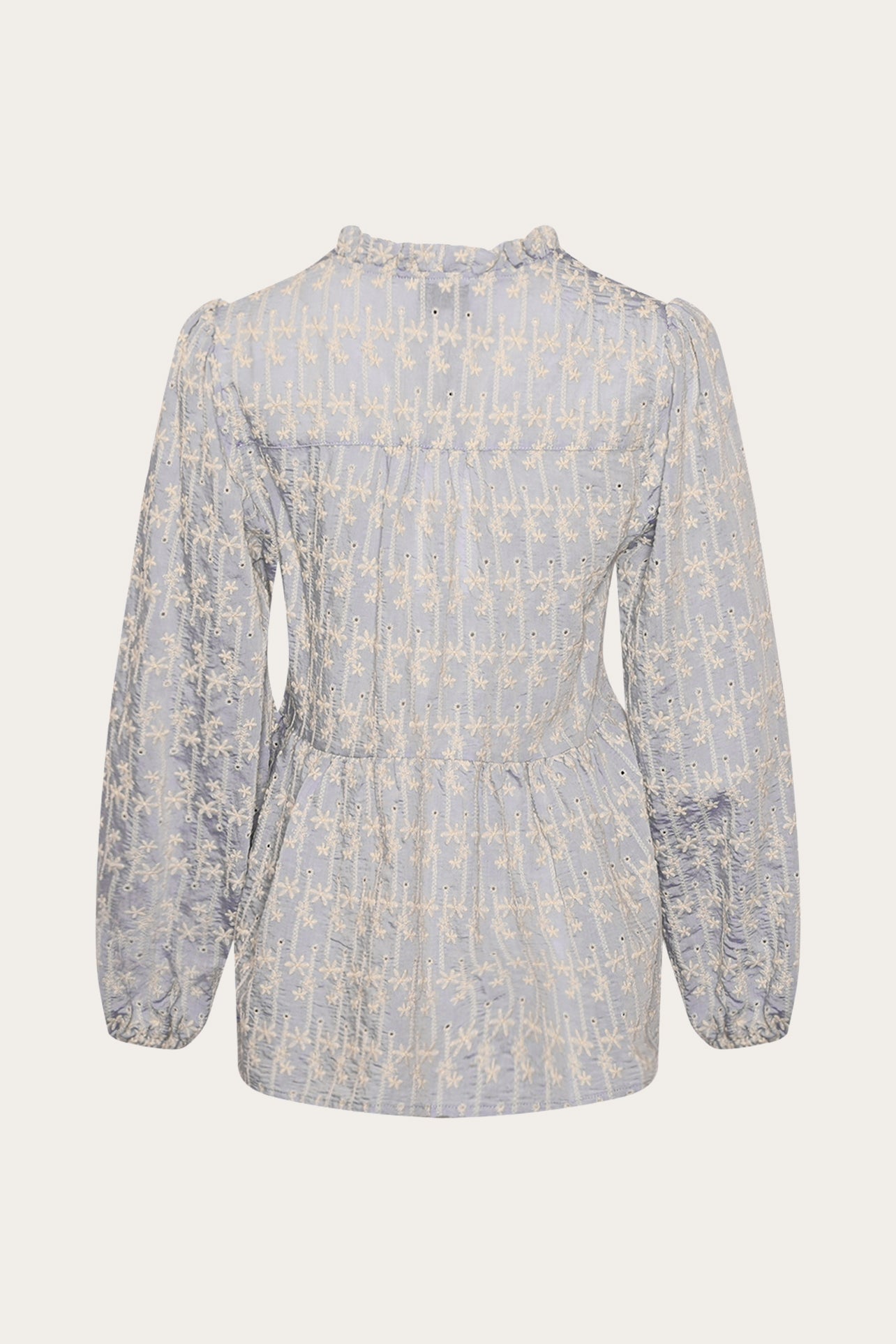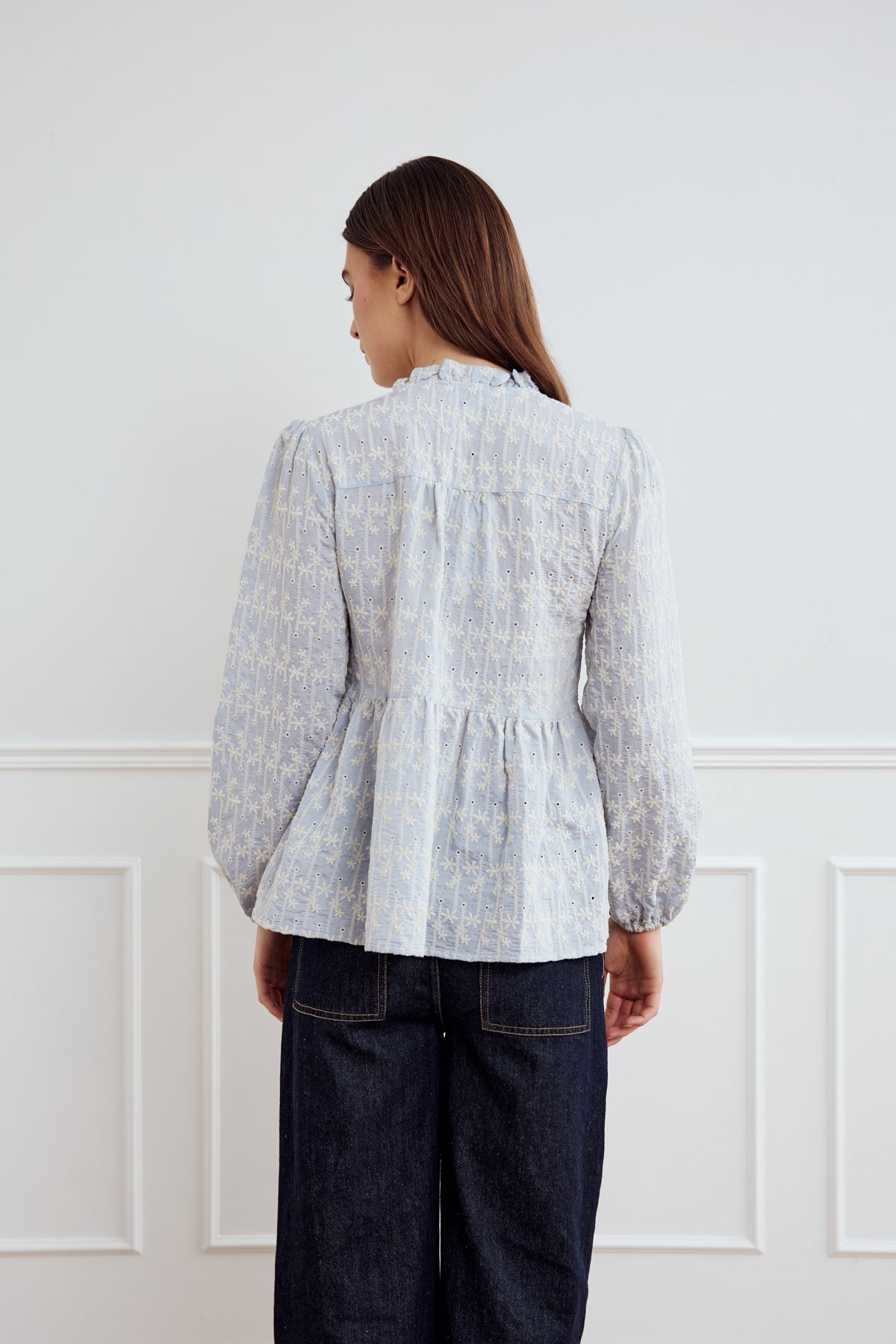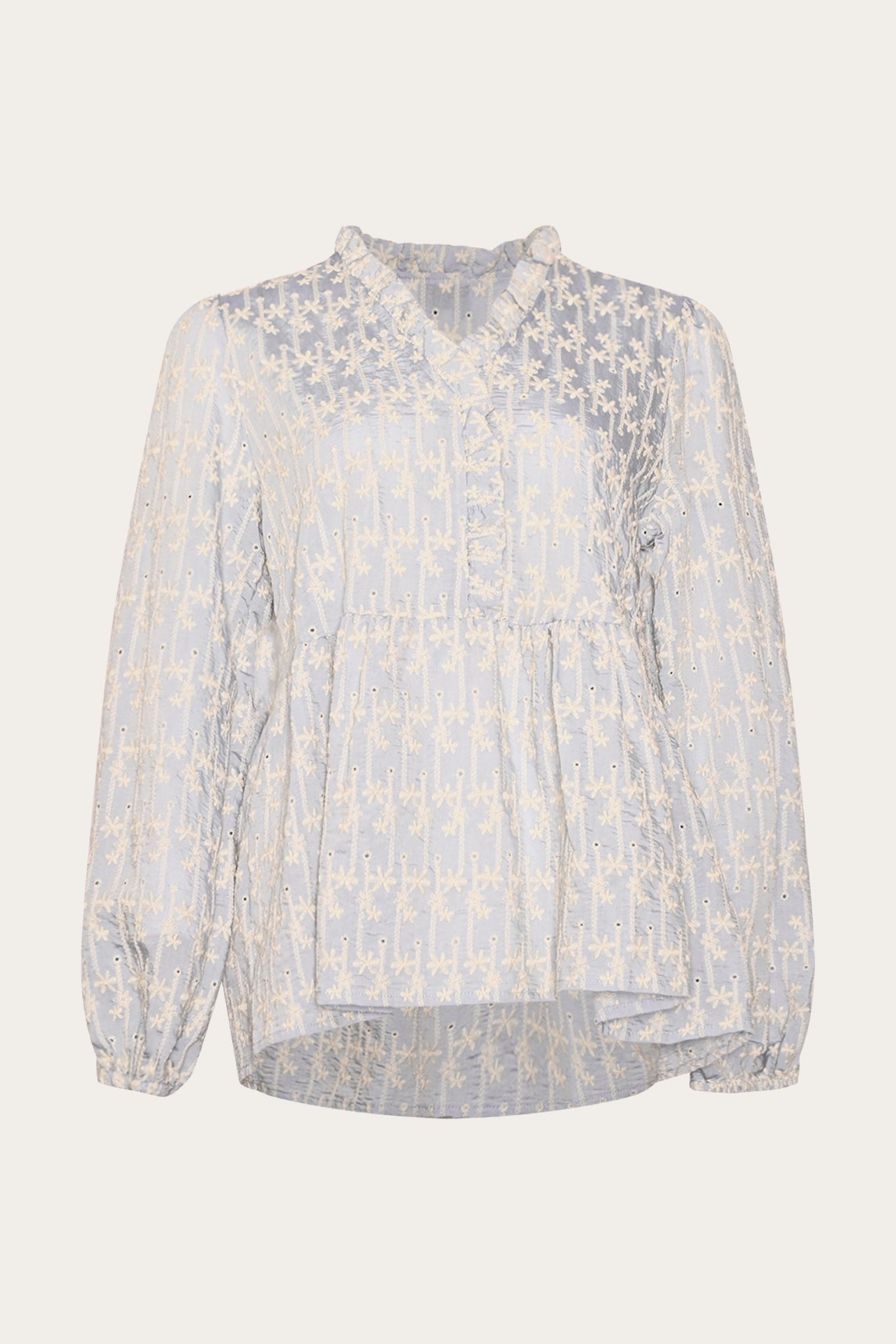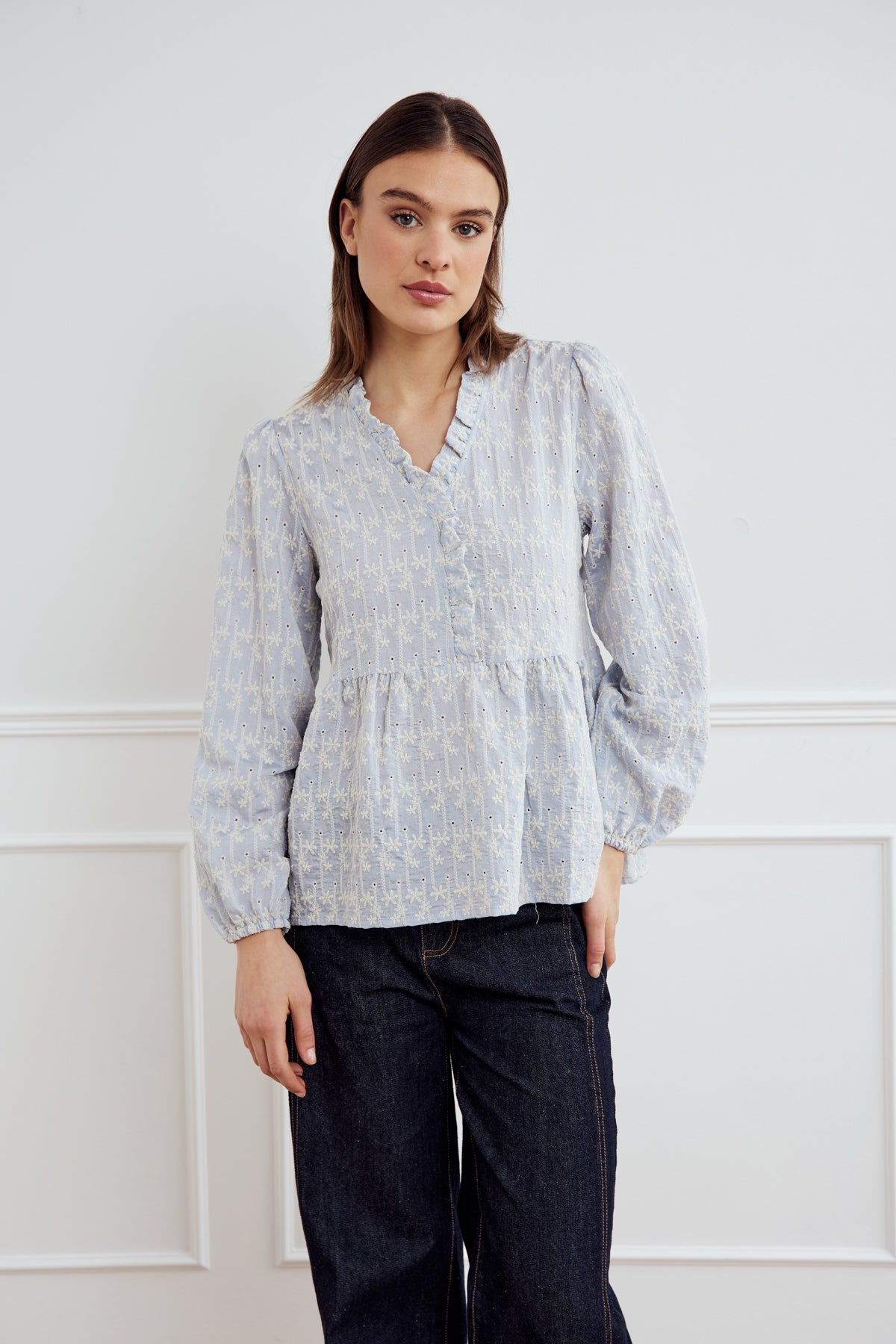 Matti Blouse is a blouse with embroidery details, a V-neck with ruffles, seams at the waist, and elastic at the sleeves.