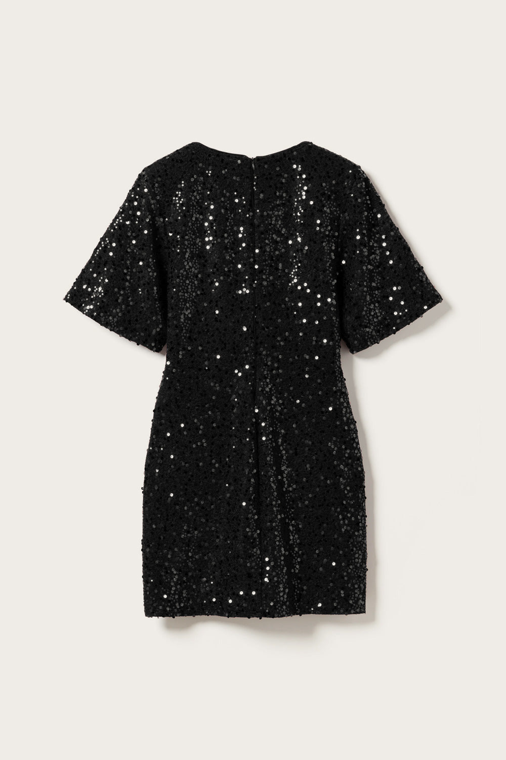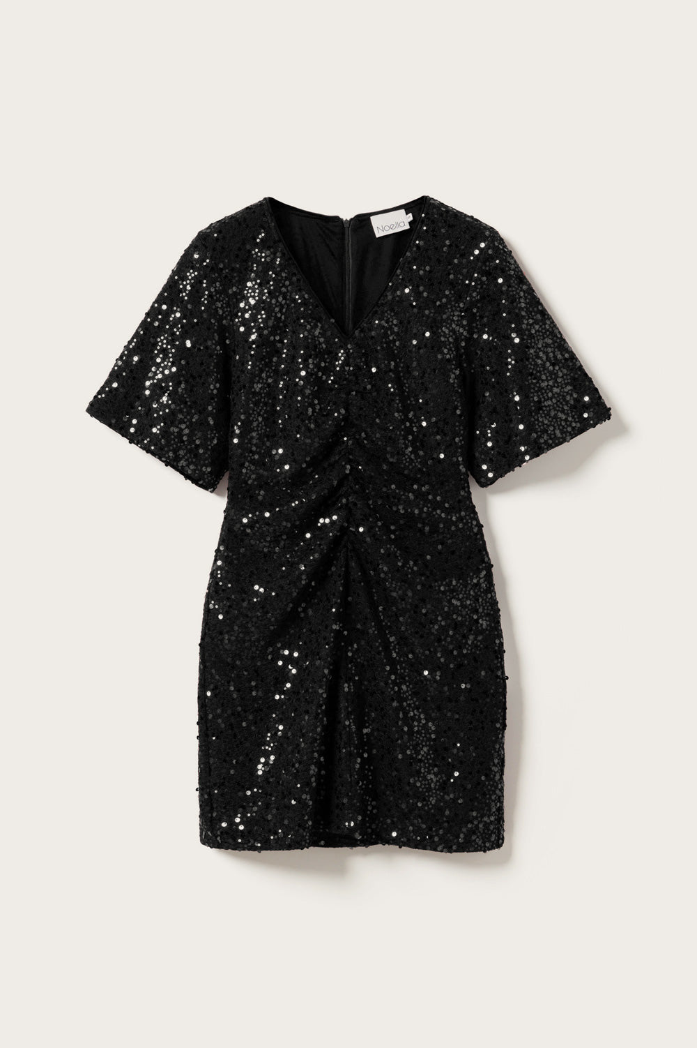 Soli Dress is a party dress with short sleeves, V-neckline, sequins, and a smock detail at the front. The dress has a fitted silhouette and is ideal as partywear.